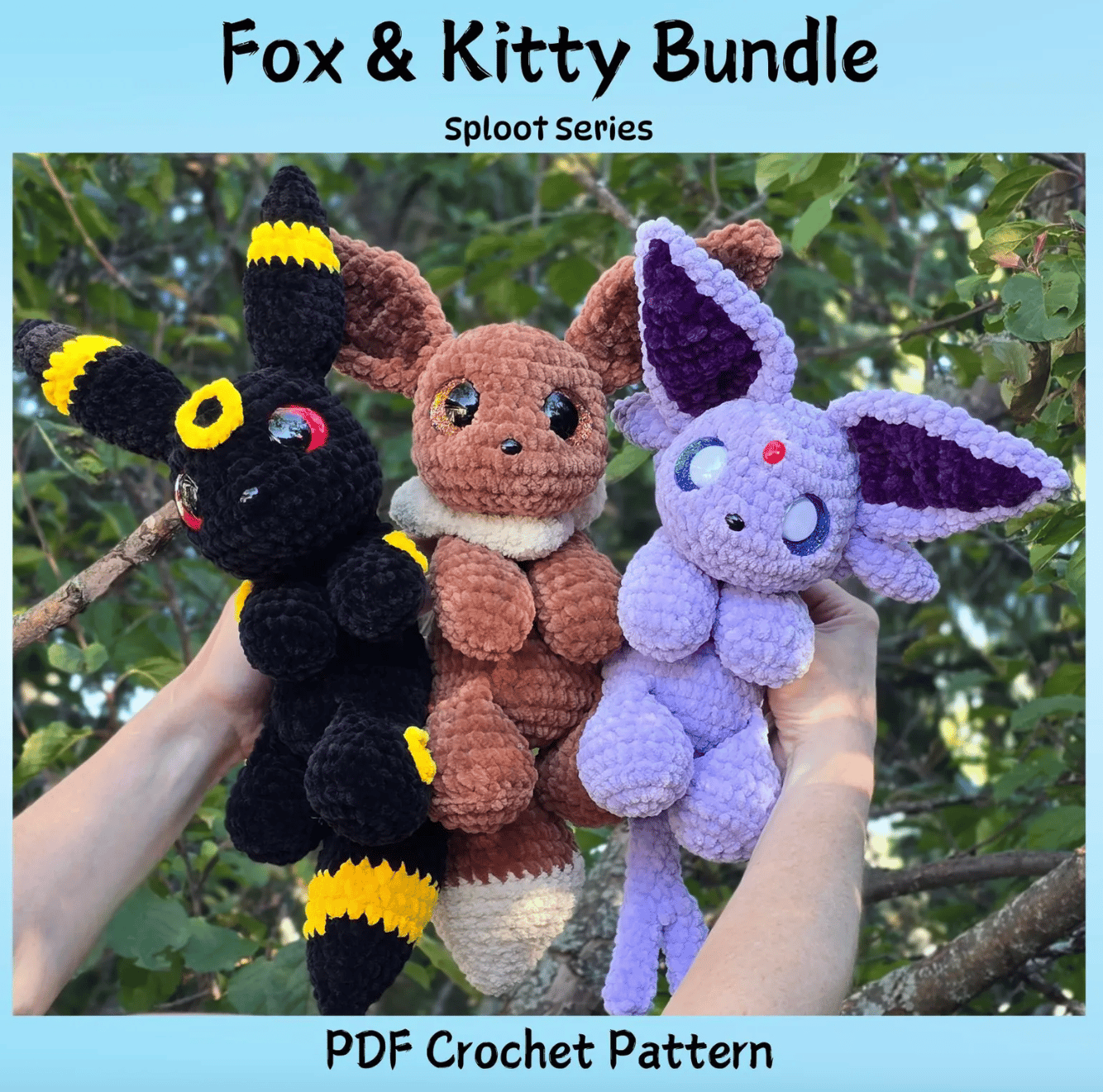 You can make your own “fox & kitty” plushies (copyright—who is Eevee?) with this bundle series by Snuggle Beans Crochet. Perfect for kids and kids-at-heart.